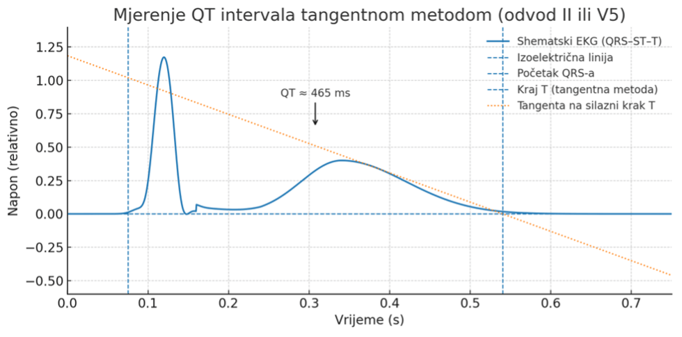 • Upute i praksa:Edukativne preporuke kliničkih društava u praksi navode odvod II ili V5 kao prvu opciju za ručno mjerenje QT-a; ako su artefakti ili atipična morfologija prisutni, odabire se najčišći odvod s jasno vidljivim T-valom.