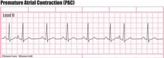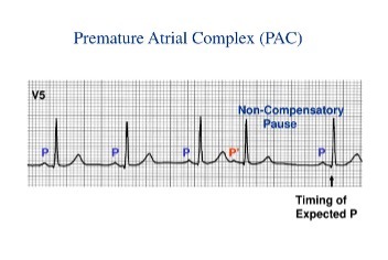 Drugim riječima, kod blokiranog PAC-a (ne provede se impuls na klijetke) vidi se rani P’ u T-valu bez QRS-a i pauza poslije; opet, od P/P ili R/R prije do sljedećeg normalnog bit će kraće od 2× bazne vrijednosti .