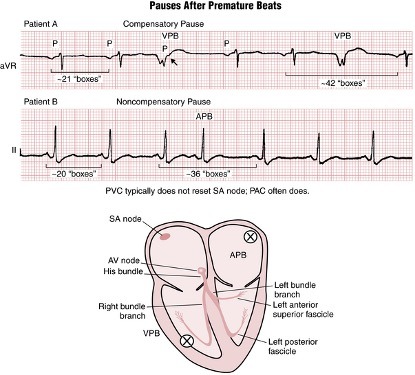 VES (PVC): razmak je≈ 2× RR → kompenzacijska pauza (SA čvor se ne resetira).