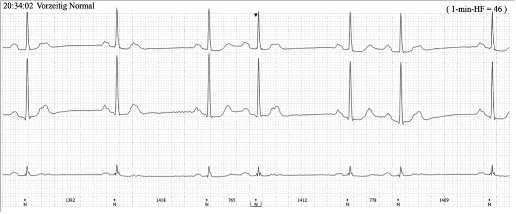 Razlog dolaska : Gospodin D.N. , 1964. godište dolazi na pregled nakon što je učinio ekg (elektrokardiografski zapis) u jednoj poliklinici privatno, a u sklopu sistematskog pregleda na koji ga šalje poslodavac. Ondje mu je liječnik savjetovao da se javi svome obiteljskom liječniku zbog navodnog neregularnog nalaza ekg-a iz te iste poliklinike (u vanjskom nalazu EKG : snimljeni su prekoridjalni odvodi od V1, v2, v3, v4, v5 te II odvod) s obzirom da je nedostatno za očitanje učini se kod nas ponovno EKG zapis.