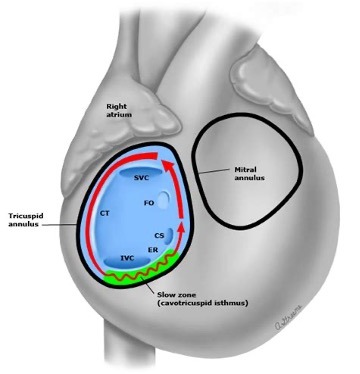 • Flutter (undulacija):najčešće makro–reentry krug u desnom atriju koji prolazi kroz kavotrikuspidni istmus (CTI); zato je CTI-ablacija logična i vrlo učinkovita “kurativna” terapija.